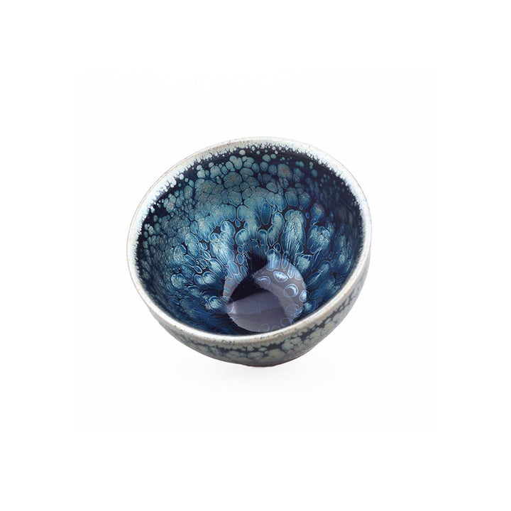 “Eye of the Blue Flame” is a kiln-born wonder — a Tenmoku teacup whose crystalline glaze dances like blue fire frozen in time. Each piece is one-of-a-kind, with natural glaze formations that resemble an eye shimmering beneath deep waters, watching, glowing, breathing.