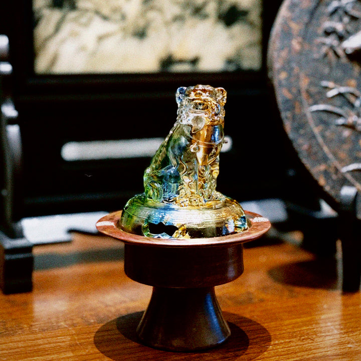 The Guardian Lion Glass Incense Burner is a stunning fusion of traditional symbolism and modern craftsmanship. Sculpted from translucent colored glass, the lion—known as a guardian of peace and power—sits majestically atop the incense lid, reflecting light in shimmering shades of amber and emerald. The dark wooden base complements the brilliance of the glass, creating a serene yet powerful presence. Ideal for meditation spaces, tea rooms, or as an artistic collectible.