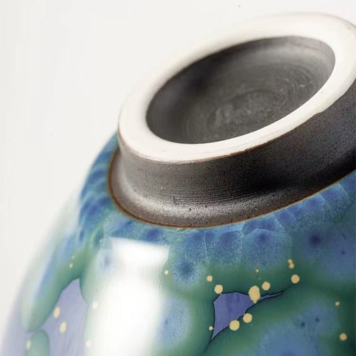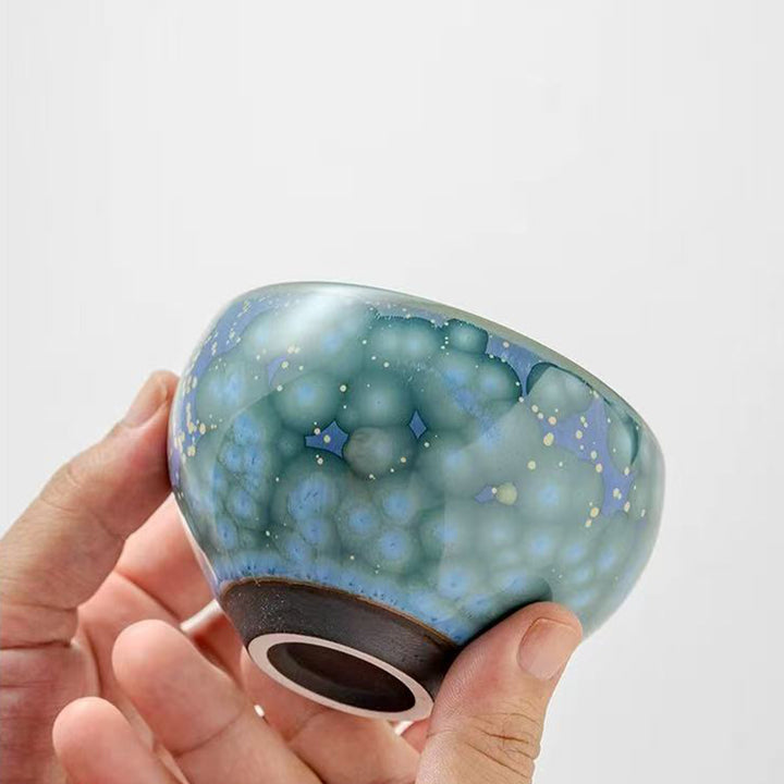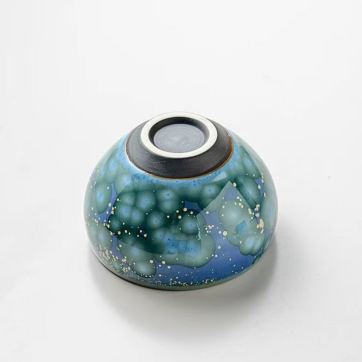 The Starry Lagoon Crystal Teacup features a deep blue-green crystalline glaze dusted with golden speckles—like stars over a calm lagoon. High-fired porcelain with a smooth lip and rounded form makes it ideal for gongfu tea or daily sipping. A collectible, handmade ceramic teacup for lovers of crystalline glaze.